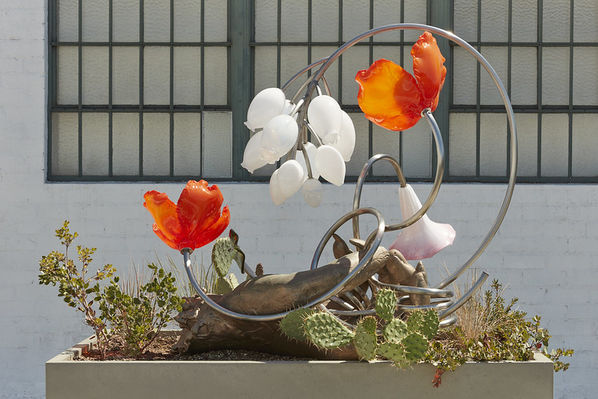 In the ground floor outdoor sculpture court Akashi presents Cultivator, a larger-than-life-sized bronze cast of her hand overgrown with glass flowers and vines. As a cast of the artist’s own flesh, the piece captures her hand in motion as if conjuring a natural world into existence. This sculpture affords a macroscopic perspective on her skin creases, cuticles, fingernails, and pores. Recreating two different living forms—flowers and flesh—this work dwells on our human interaction with nature. Incorporating plants during Aspen’s warmer months, Cultivator presents the possibility of growth from decay, and joins together materials that are at once delicate and durable. In doing so, Akashi’s sculpture takes on qualities that are at once uncanny, appealing, and familiar.