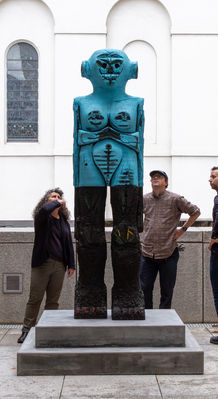 Huma Bhabha (born 1962) is a Pakistani-American sculptor based in Poughkeepsie, New York. Known for her uniquely grotesque, figurative forms that often appear dissected or dismembered, Bhabha often uses found materials in her sculptures, including styrofoam, cork, rubber, paper, wire, and clay. She occasionally incorporates objects given to her by other people into her artwork. Many of these sculptures are also cast in bronze. She is equally prolific in her works on paper, creating vivid pastel drawings, eerie photographic collages, and haunting print editions.